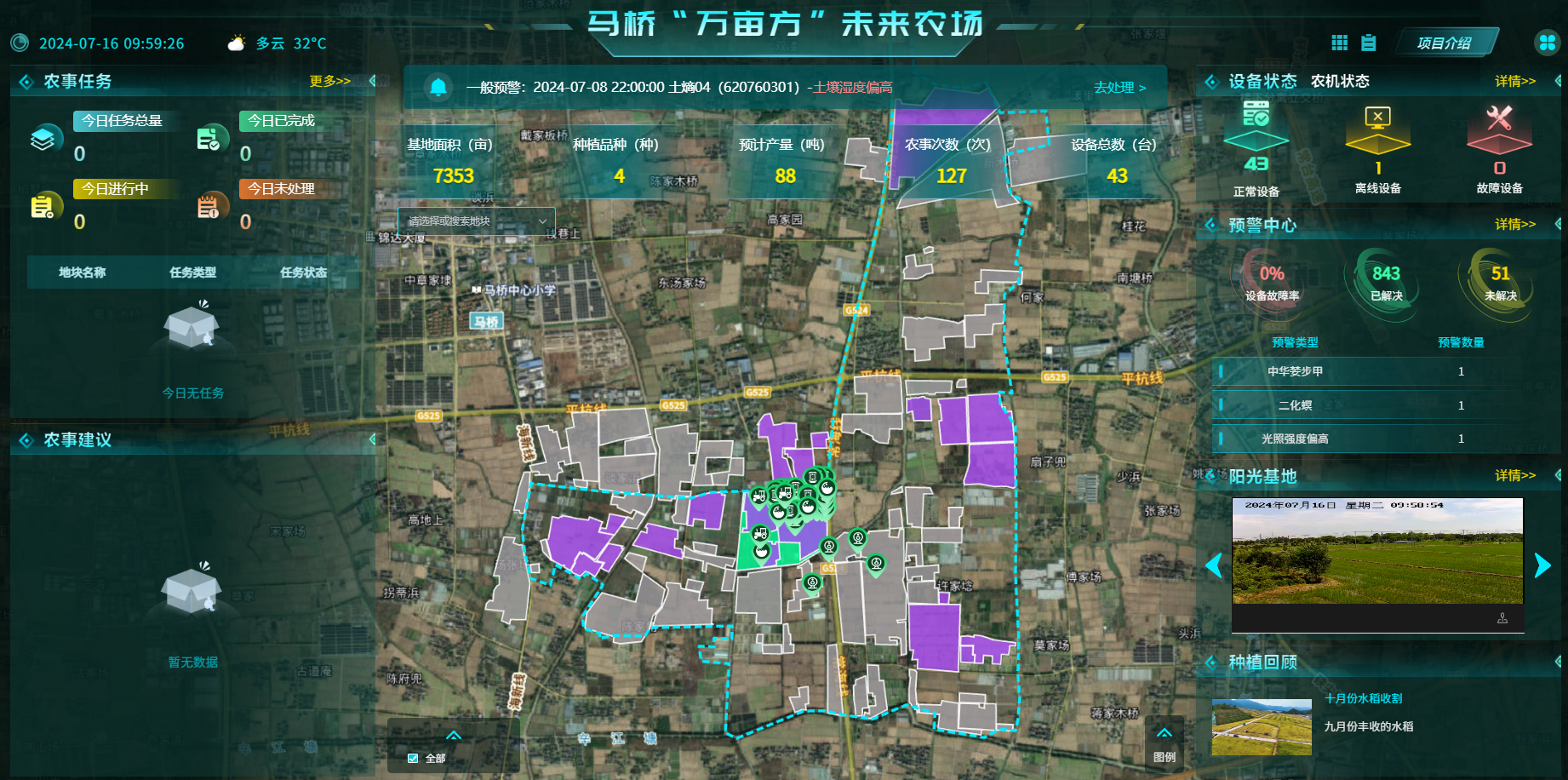 而在海寧馬橋“萬畝方”項目現場,伴隨著多日來的高溫天氣,“萬畝方”未來農場數字駕駛艙中發出了“空氣濕度偏低”的智能預警,灌排系統開始在物聯網設施的協同配合下自動調節田間溝渠水位,并向作業服務人員給出了相應農事建議。項目負責人表示,通過該系統還能實現氣象預警、遙感監控等功能,讓該項目真正成為在“三夏”時節無懼旱澇的“智慧農田”。